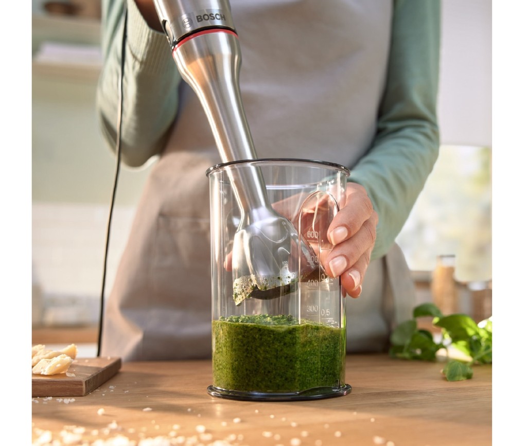 شرکت سازنده یک لیوان پایه بلند شفاف درجه بندی شده با ظرفیت 600 میلی لیتر برای این محصول در نظر گرفته است. با استفاده از پیمانه مخلوط کردن/اندازه گیری می توانید مواد را اندازه بگیرید و مقادیر کم مواد غذایی را مستقیماً در لیوان مخلوط کنید. این لیوان بلند از پاشش مواد غذایی و ریخته شدن آن روی میز و کابینت ها جلوگیری می کند.
